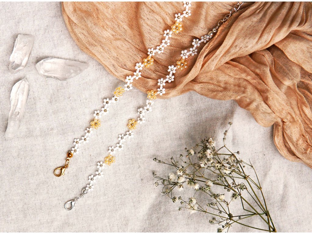 Ručně vyráběný květinový náramek Heřmánek z kvalitních japonských korálků MIYUKI – šperk, který uklidňuje