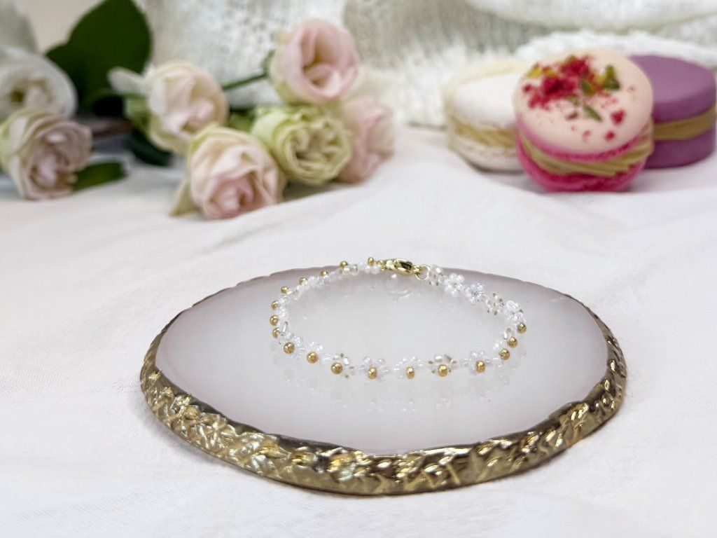 Tento jemný květinový náramek je ideální jako dárek pro vaše blízké nebo jako osobní symbol vlastní jedinečnosti. Každý kus je ručně vyráběný, a proto se může mírně lišit. Právě v těchto drobných detailech se skrývá kouzlo opravdové originality.